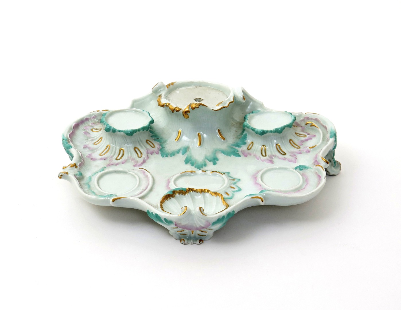A Meissen surtout de table or stand 19th century, of rococo scrolling form, raised on three scroll feet and picked out in green, pink and gilt, blue crossed swords mark, 32cm across.