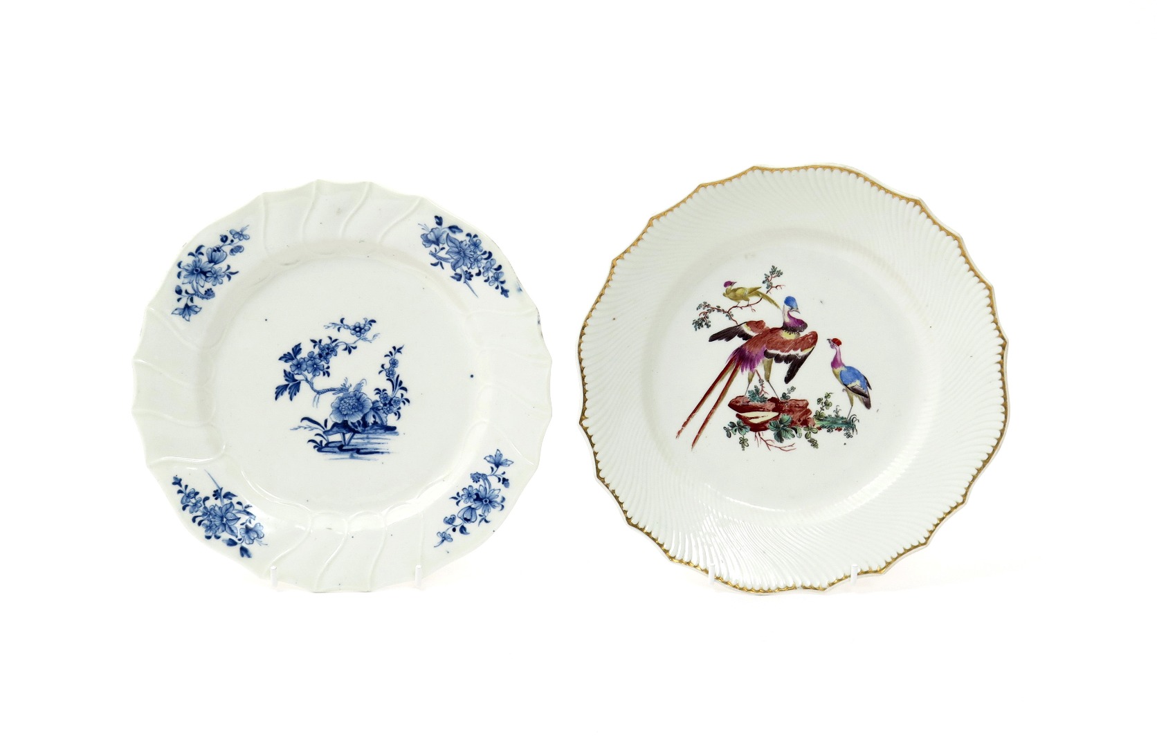 Two Tournai plates c.1770-80, one brightly enamelled with fancy birds perched on a low rock, within a close spiral moulded rim, the other with wide spiral flutes and painted in blue with the Ronda pattern of peony and prunus, gilt and blue swords and stars marks respectively, the latter with an N mark, 23.8cm max. (2)