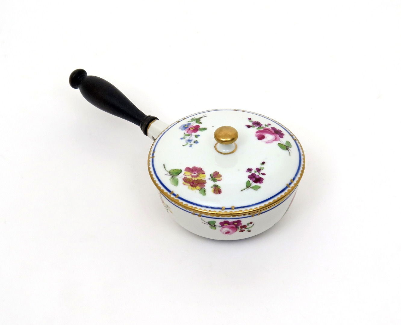 A Sèvres-style saucepan or warming pot and cover late 18th/early 19th century, the flattened circular body painted with sprays of flowers within a blue and gilt rim, fitted with a turned wooden handle, interlaced LL mark, painter's and initial marks in blue, 18.3cm. (2)