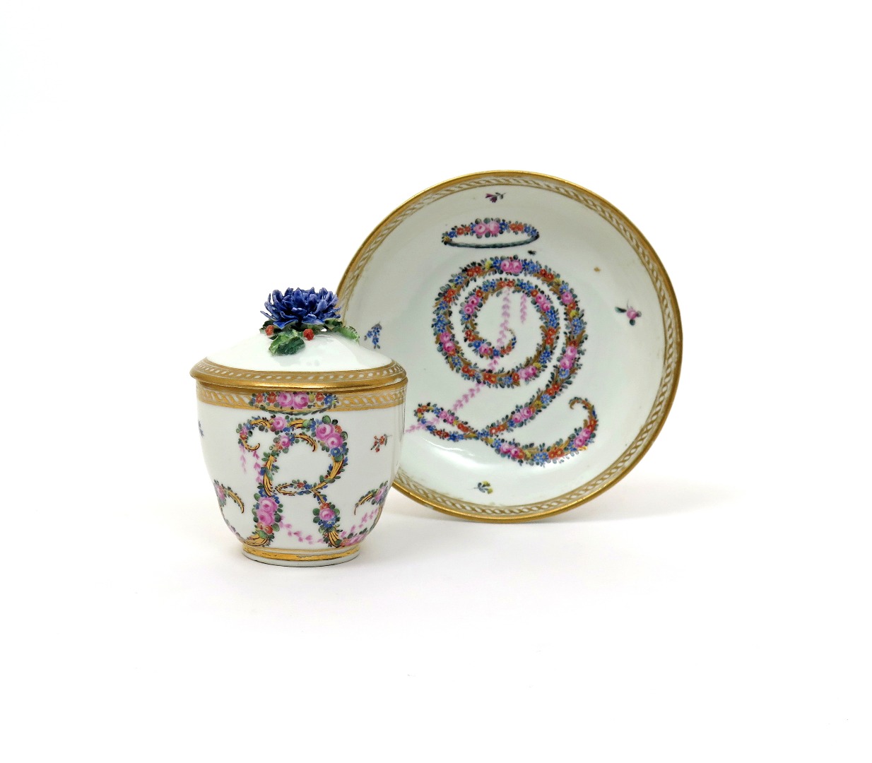 A Nymphenburg covered cup and saucer c.1780, painted with delicate floral garlands spelling out the letter R to the cup, and the number 2 to the saucer, each with a floral diadem above, the cover surmounted with a large blue flower, impressed shield mark to the saucer, 14.2cm. (3)
