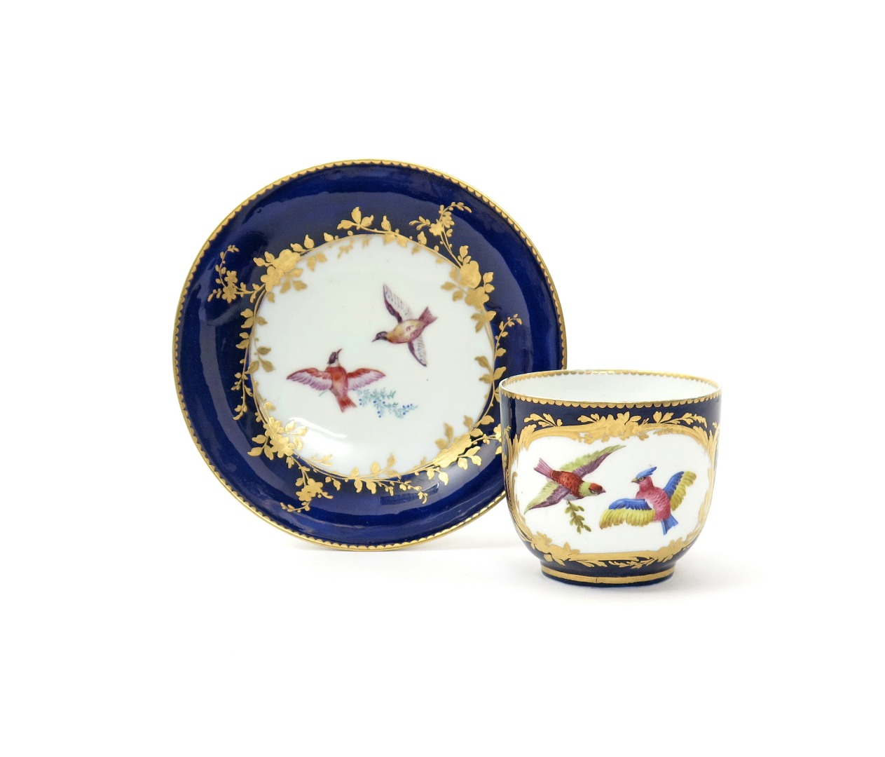 A matched Vincennes or Sèvres cup and saucer c.1755-60, painted with panels of colourful birds in flight and holding leaf sprigs, reserved on a bleu lapis ground within gilt foliate and floral borders, interlaced LL marks, date code F and painter's mark to the saucer, 13.4cm. (2)