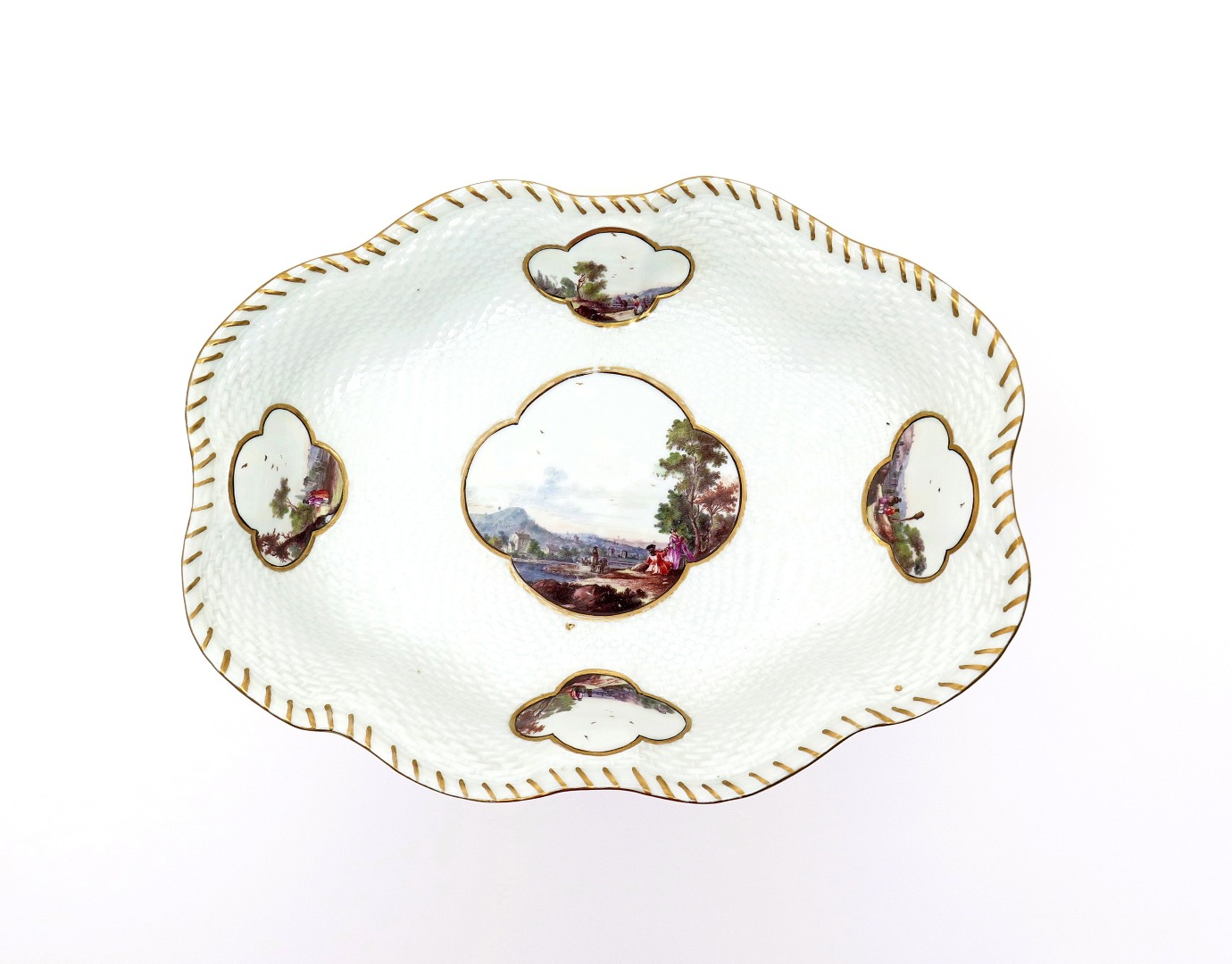 A good Meissen quatrefoil dish c.1740, moulded with a dense basketweave design, the well with a quatrefoil panel of figures beside a river with buildings and mountains in the background, the rim with four further landscape panels, blue crossed swords mark, 29.5cm.