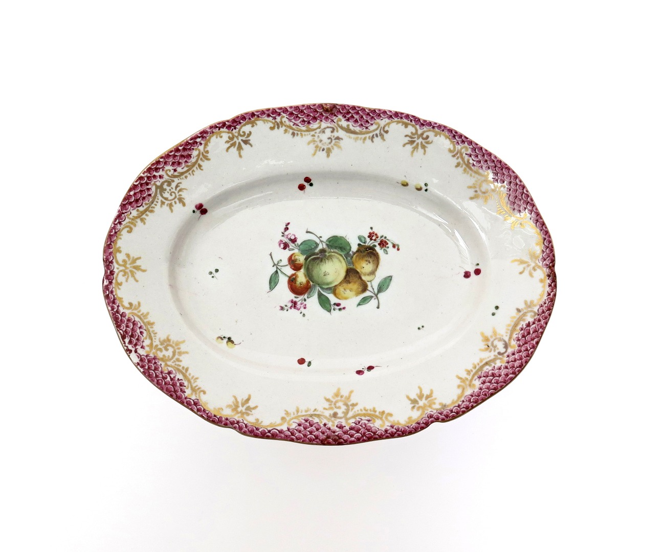 A Cozzi small oval dish c.1770, the well painted with a spray of fruit including pears and apples, the cavetto with tiny scattered flower sprigs, the rim with a shaped pink diaper border within gilt foliate scrolls, red anchor mark, 22.5cm.