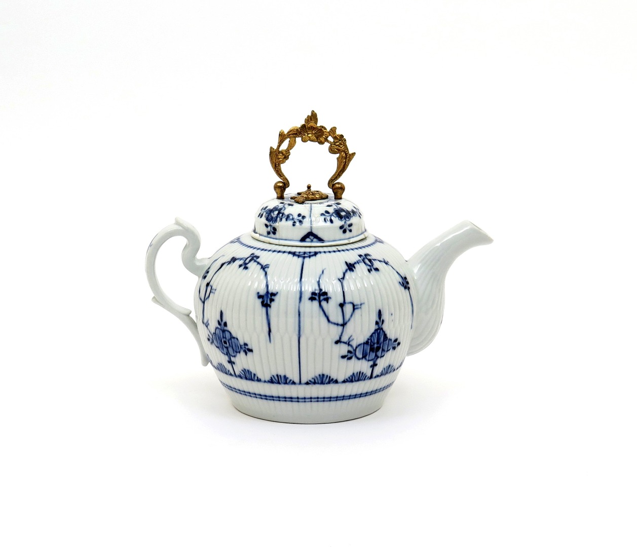 A Wegely teapot and associated cover c.1755-57, the body moulded with bands of reeding and painted in underglaze blue with a version of the Strawflower pattern, blue W mark, the cover fitted with a gilt metal finial and overhead handle, 22.5cm. (2)