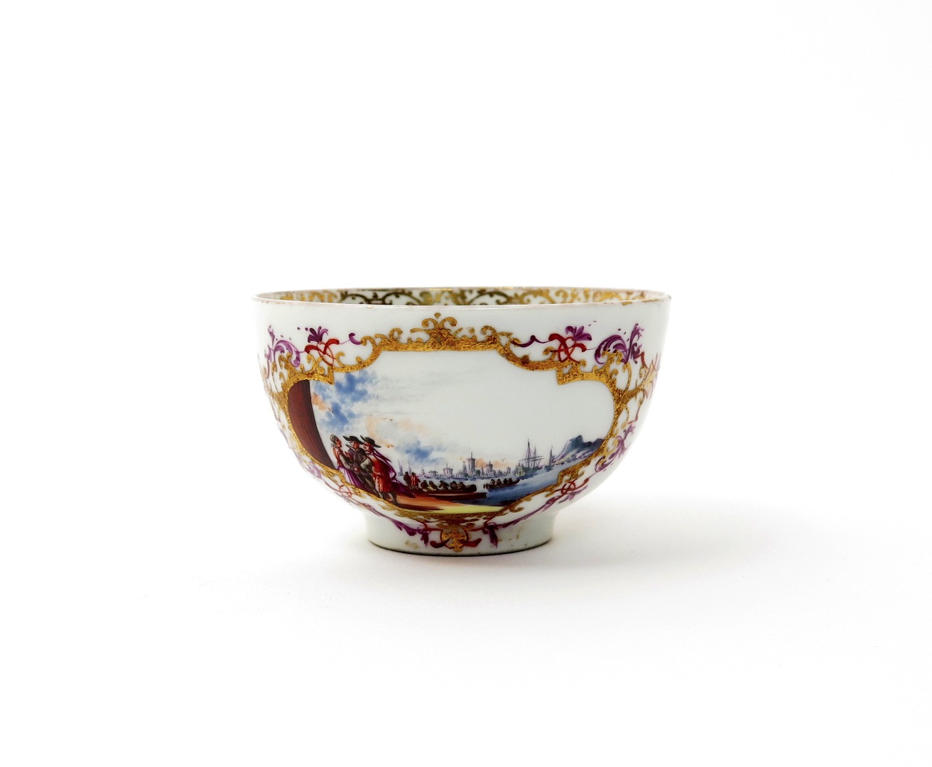 A Meissen teabowl c.1735, painted to two sides with panels of European merchants in harbour scenes, within gilt, red and purple strapwork borders, the interior with a spray of indianische Blumen and a wide gilt strapwork border, blue crossed swords and gilt A marks, some gilt wear, 8cm dia.
