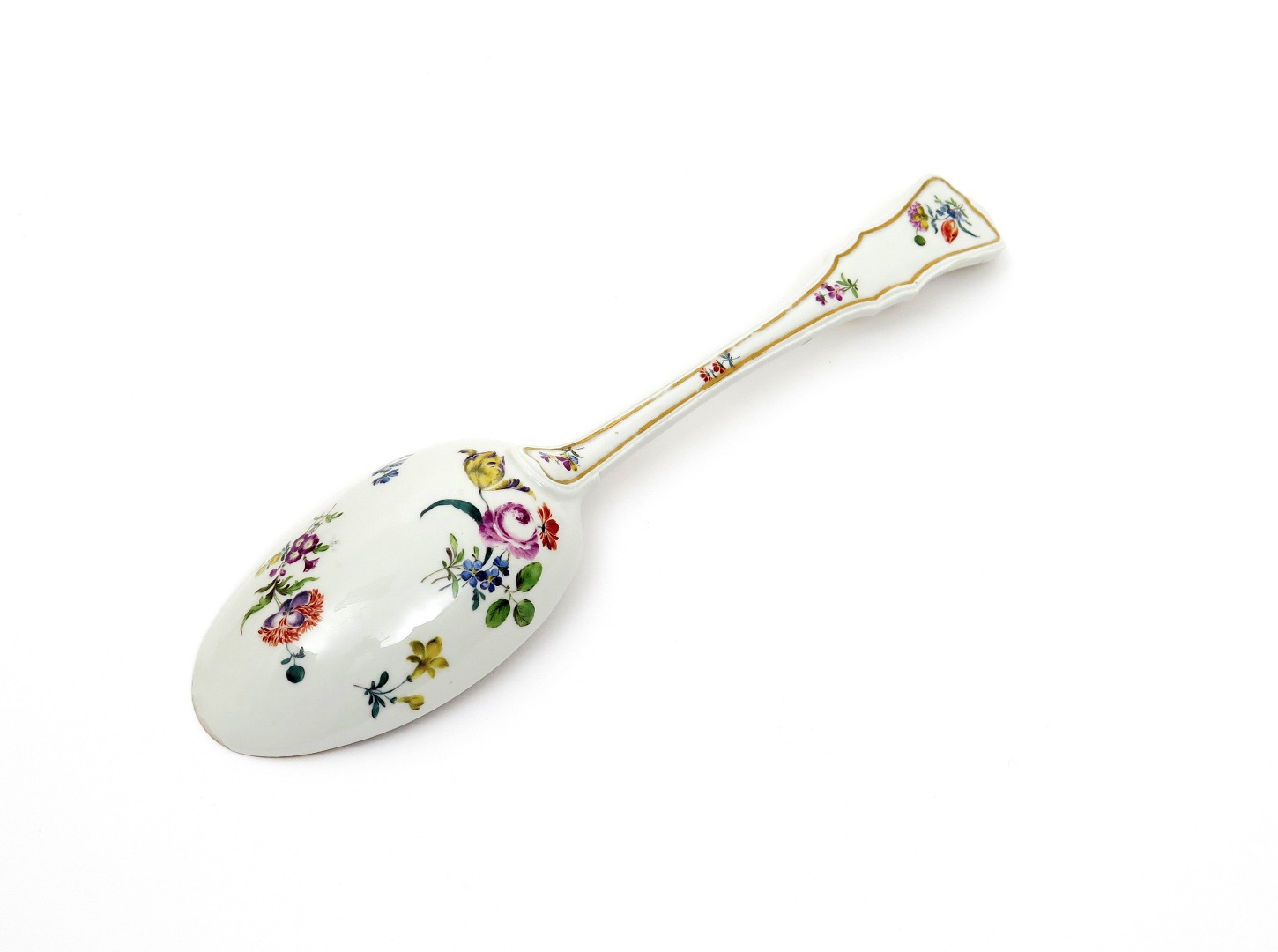 A good Meissen serving spoon c.1750-60, well painted to both sides with sprays of deutsche Blumen and small scattered sprigs, the shaped handle edged in gilt, 31.3cm.
