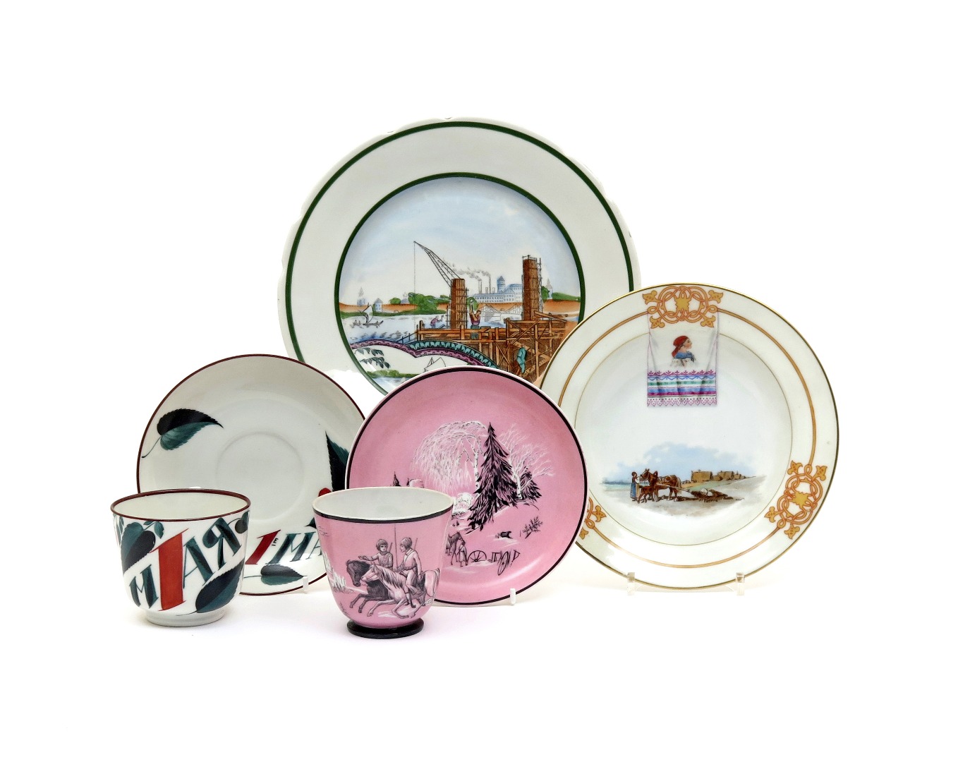 Two Russian porcelain cups and saucers with Soviet Propaganda designs, Imperial Porcelain Manufactory dated 1892, 1898 and 1917, one painted in black and white on a pink ground with equestrian figures beneath wintry trees, hammer and sickle mark for 1922, the other with cyrillic text between large leaves after a design by Rudolf Vilde, a Russian porcelain plate showing the construction of a large bridge, and a mid 20th century soup bowl printed with a banner above a horse pulling a plough, various marks, 24.7cm max. (6)