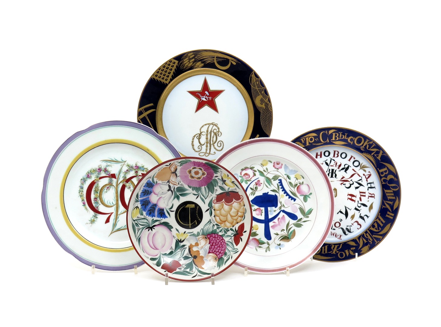 Five Russian porcelain plates with Soviet Propaganda designs 20th century, four after designs by Sergei Chekhonin, one copying a famous design of a hammer and sickle on a black roundel within a wide border of fruit and flowers, one with two red sickles around floral garlands, another with a central hammer and sickle surrounded by cyrillic letter, the last with a blue hammer and sickle on a floral ground, another plate originally designed by Mikhail Adamovich with a gilt monogram above a five-pointed star, the blue rim with gilded instruments of labour, various marks, 26.7cm max. (5)