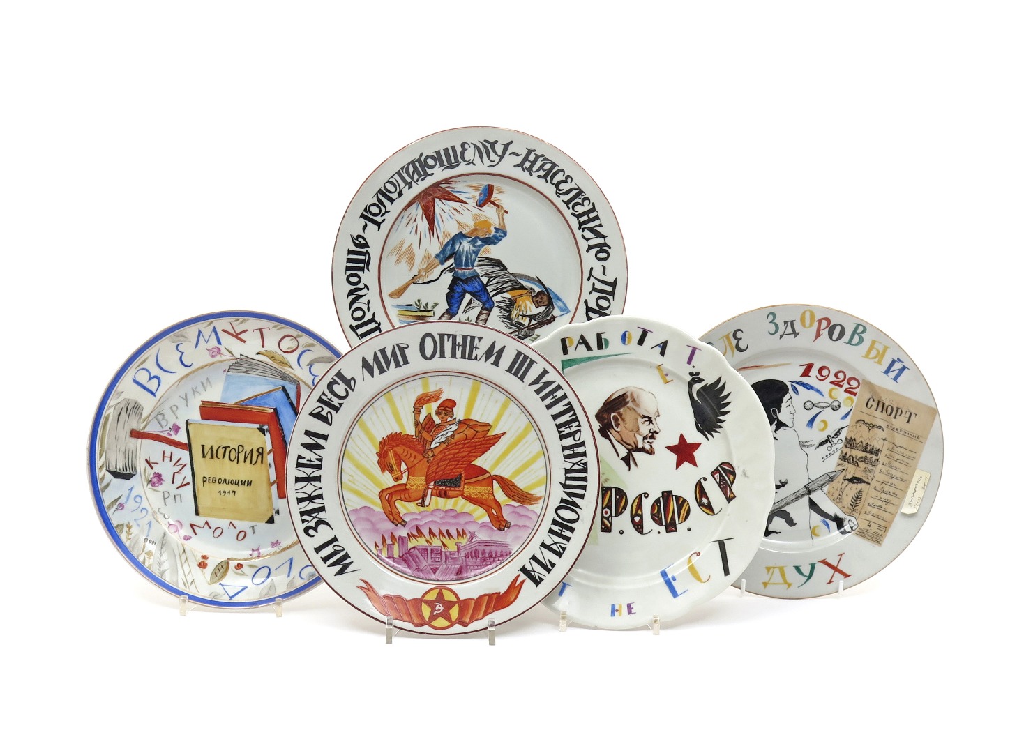 Five Russian porcelain plates with Soviet Propaganda designs 20th century