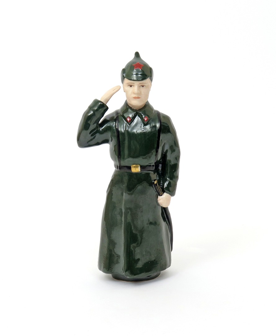 A Soviet Russian porcelain figure 20th century, of a Red Army soldier in full uniform, saluting with his right hand and holding a sword in his left, incised hammer and sickle mark, inscribed 1927 but probably later, 25cm.