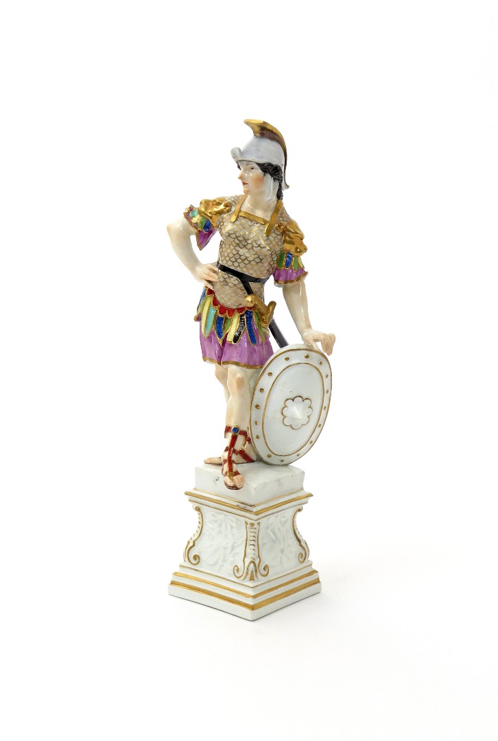 A Meissen figure of Mars mid 18th century, modelled by J F Eberlein, standing atop of a square pedestal base moulded with musical instruments and victory motifs, his left hand resting on the top of his shield, his right on his hip, wearing a chainmail tunic with lion mask sleeves, some restoration, 29.3cm.