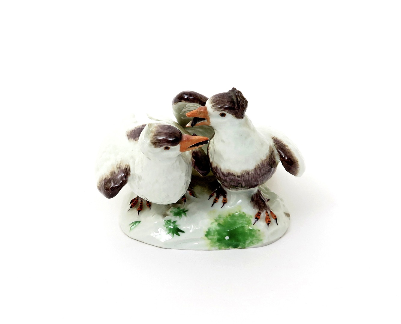 A Continental porcelain group of two billing doves 19th century, after Meissen, perched on a low grassy base with heads turned in together, naturalistically modelled, some damages, 10.3cm high.