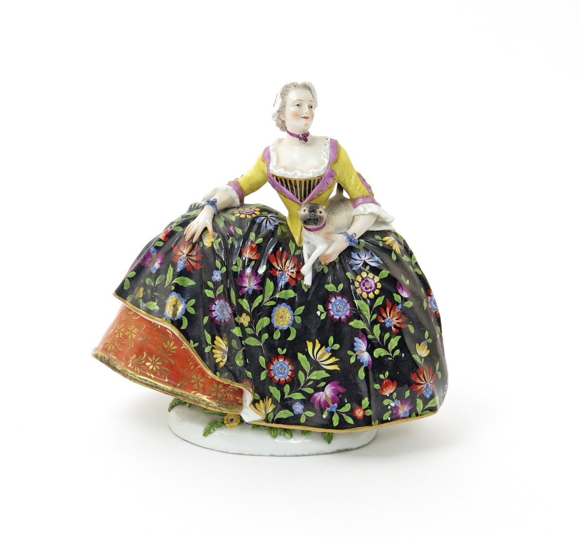 A Samson crinoline figure of a lady of the 'Mopsorden' late 19th century, after Kändler's model at Meissen, wearing a wide and boldly patterned crinoline skirt, holding a pug dog under her left arm, the oval base applied with flowers, pseudo blue crossed swords mark, a few small chips, 22cm high.