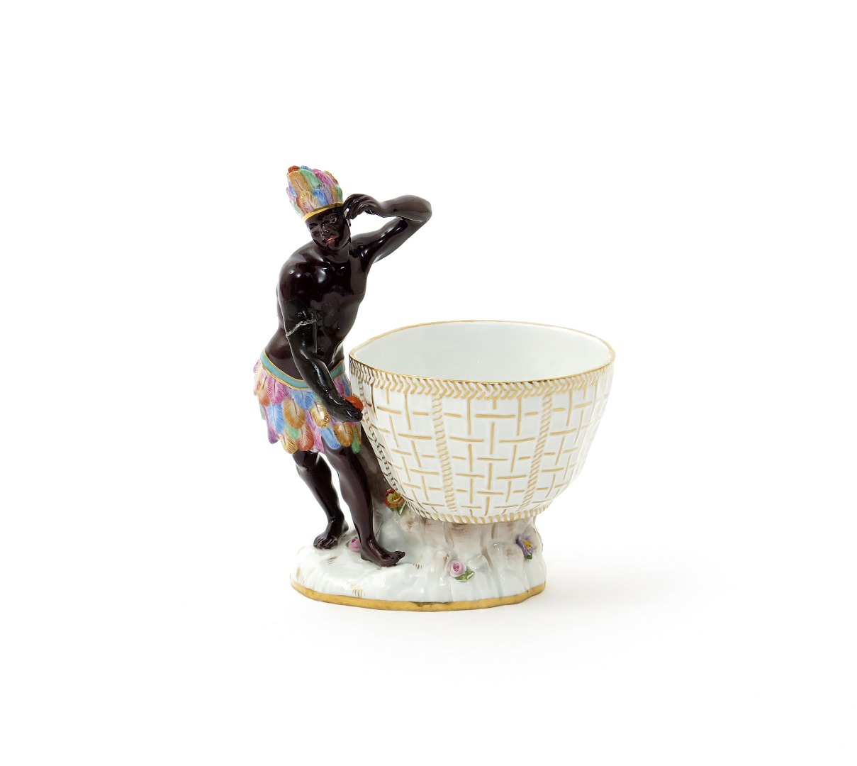 A Meissen sweetmeat figure 19th century, modelled as a blackamoor wearing a colourful feathered skirt and headdress, standing beside a large basket on a low base applied with flowers, blue crossed swords mark, incised 336, restoration to his right arm, 16.8cm high.
