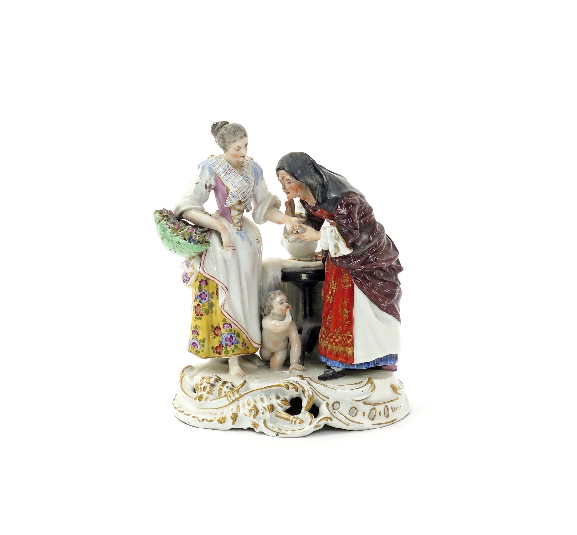 A Samson figure group of the Fortune Teller late 19th century, in the Meissen manner, a young maiden with a basket of flowers, having her palm read by an old crone while Cupid whispers to her between their skirts, pseudo blue crossed swords mark, small damages, 20.5cm high.