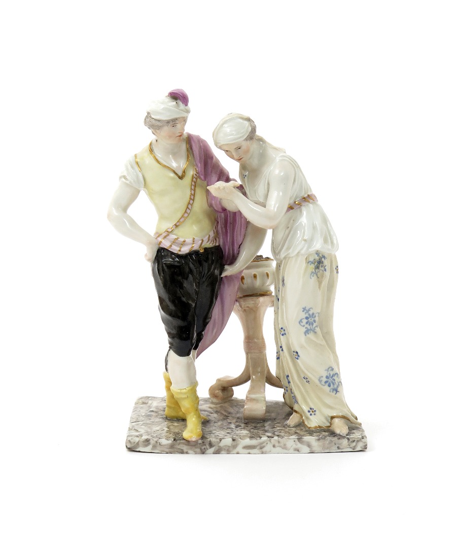 A Ludwigsburg figure group of a fortune teller c.1770, an unwary traveller having his palm read by a young maiden who surreptitiously picks his pocket while she distracts him, a brazier of flaming coals alight on a table behind them, raised on a rectangular marbled base, blue crowned CC monogram, some restoration, 21cm.