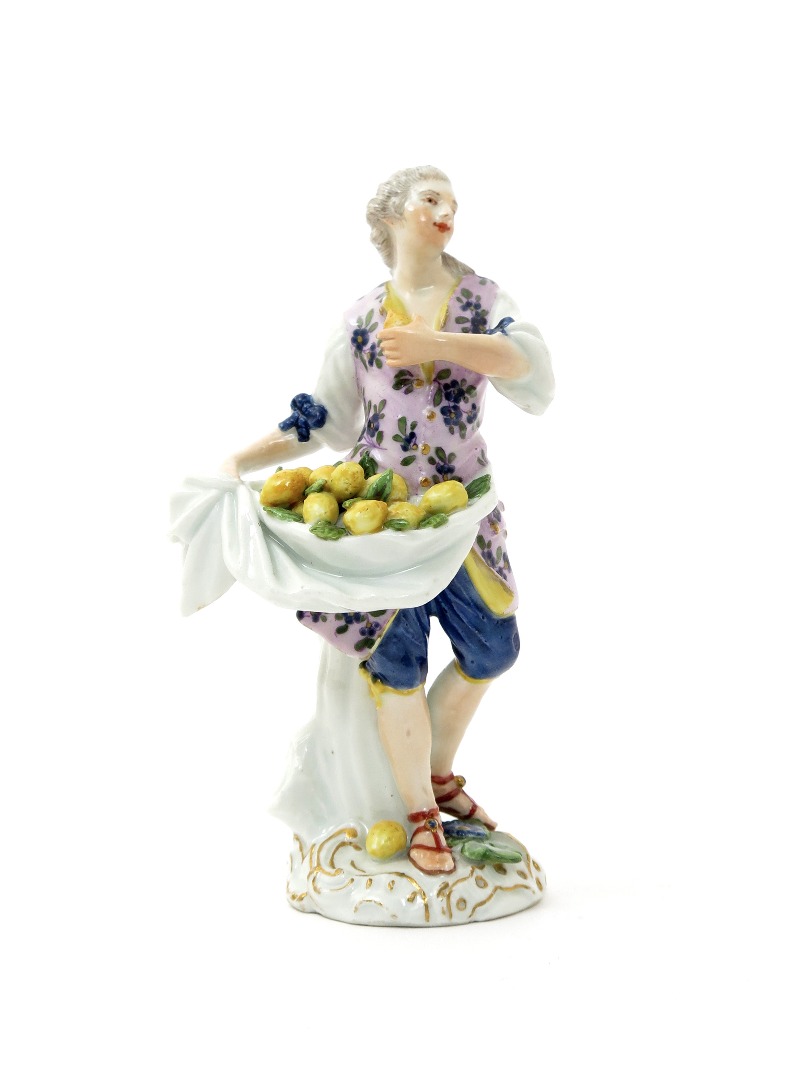 A Meissen Cris de Paris figure of a lemon seller c.1755, modelled by F E Meyer, holding the edges of his white apron, filled with lemons, a single fruit held in his left hand, and another escaped beside his right foot, wearing a lilac tunic patterned with flowers, faint traces of a blue crossed swords mark, a little good restoration, 13.5cm.