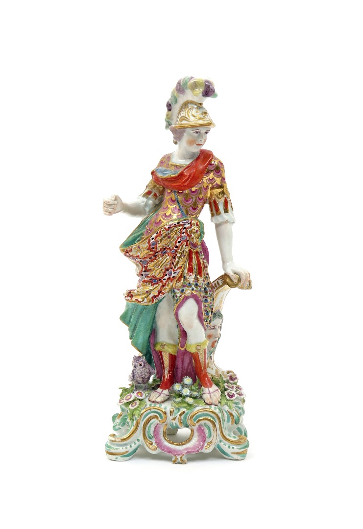 A large Bow figure of Minerva c.1760-65, standing on a tall scrolled base, resting one hand on her shield bearing the face of the Gorgon, wearing a plumed helmet and brightly coloured costume, an owl perched by her right foot, red anchor and dagger mark, some good restoration, 34.3cm.
