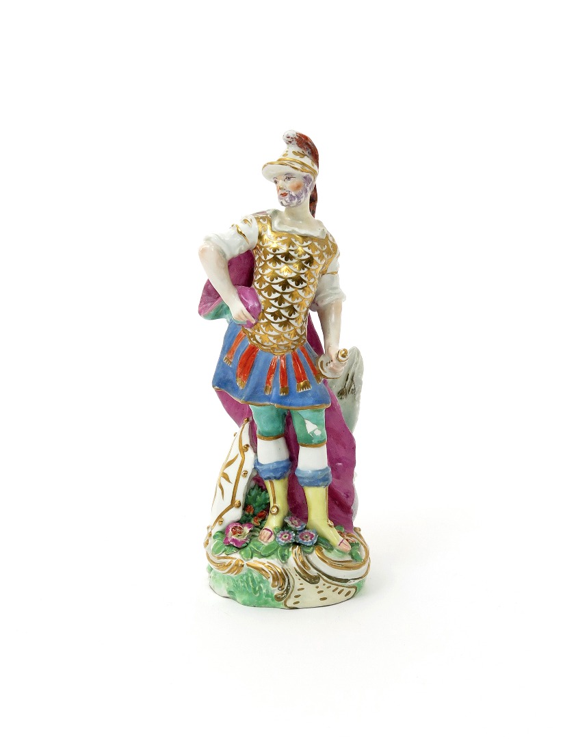 A Chelsea figures of Mars c.1765, dressed in the manner of a Roman centurion, standing with his right hand on one hip, his left holding the hilt of his sword, a shield resting on the scrolled base to one side, the flag of St George behind, gold anchor mark, some restoration, 20cm.