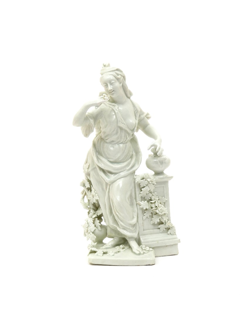 A large Bow white-glazed figure of Flora c.1756-60, emblematic of Smell from a set of the Five Senses, holding a small posy up to her nose, standing beside a pierced urn resting atop a square pillar garlanded with flowers, a small amount of good restoration, 28cm.