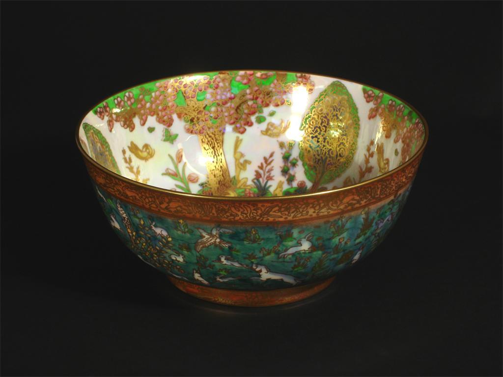'Hares, Dogs and Birds' a rare Wedgwood Fairyland lustre Imperial bowl designed by Daisy Makeig-Jones, printed in colours and gilt on a green lustre ground, the interior pearl lustre printed and painted marks, minor nicks to base rim 23cm. diam. This design was introduced in November 1927 and cancelled in December 1929.