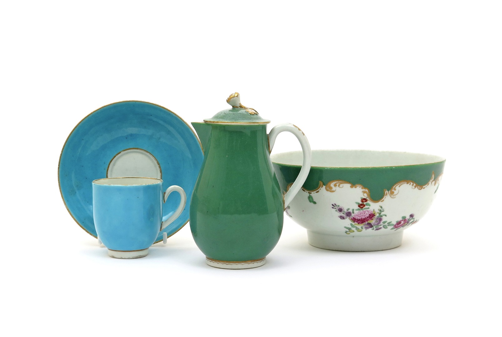 A group of Worcester porcelains c.1765-70, including a slop bowl painted with polychrome flower sprays beneath a shaped green border edged in gilt, a jug and cover decorated in an allover apple green glaze, and a coffee cup and saucer decorated in a turquoise glaze, blue crossed swords and 9 marks to the bowl and saucer, some wear, 16.3cm max. (5)