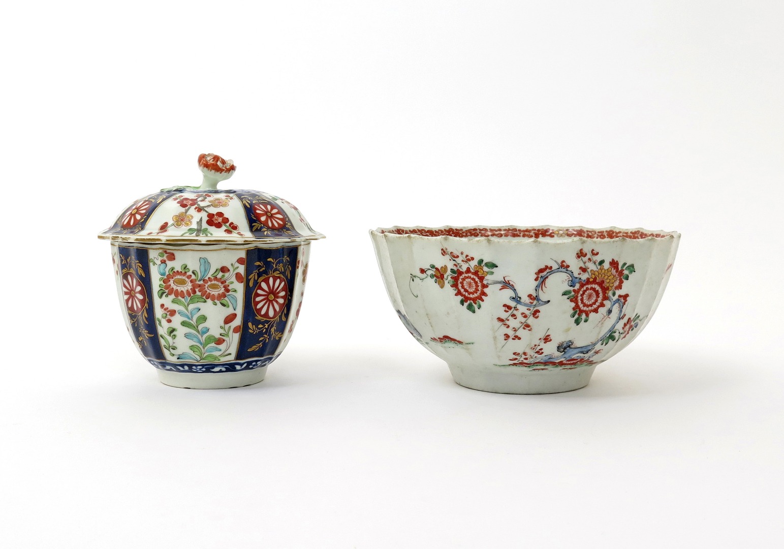 A Worcester sucrier and cover c.1775, of Warmstry fluted form, painted with a Japan pattern of wide panels of Kakiemon foliage and narrow mons on a blue ground, square seal mark, and a fluted slop bowl painted with the Two Quail pattern, a little chipping, a crack to the bowl, 15.2cm max. (3)
