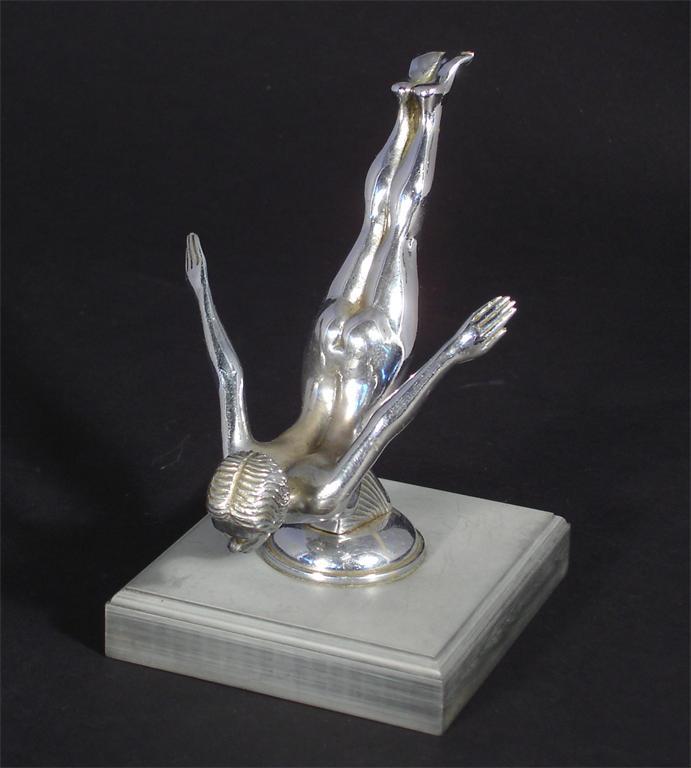 A silvered metal car mascot modelled as a diving nude