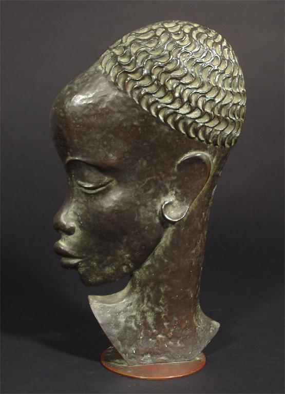 A large Hagenauer patinated bronze head on circular copper base, stamped marks 30cm. high