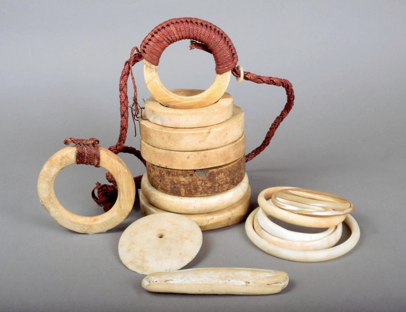 including a pectoral with woven and dyed red fibre, 8cm diameter, another with remains of applied fibre, six other rings, 11cm - 8cm diameter, six shell armbands, 10cm - 6.5cm diameter, a circular pendant, of slightly domed form with a pierced centre, 7.2cm diameter and a shell oblong implement, 11.3cm long. (16)