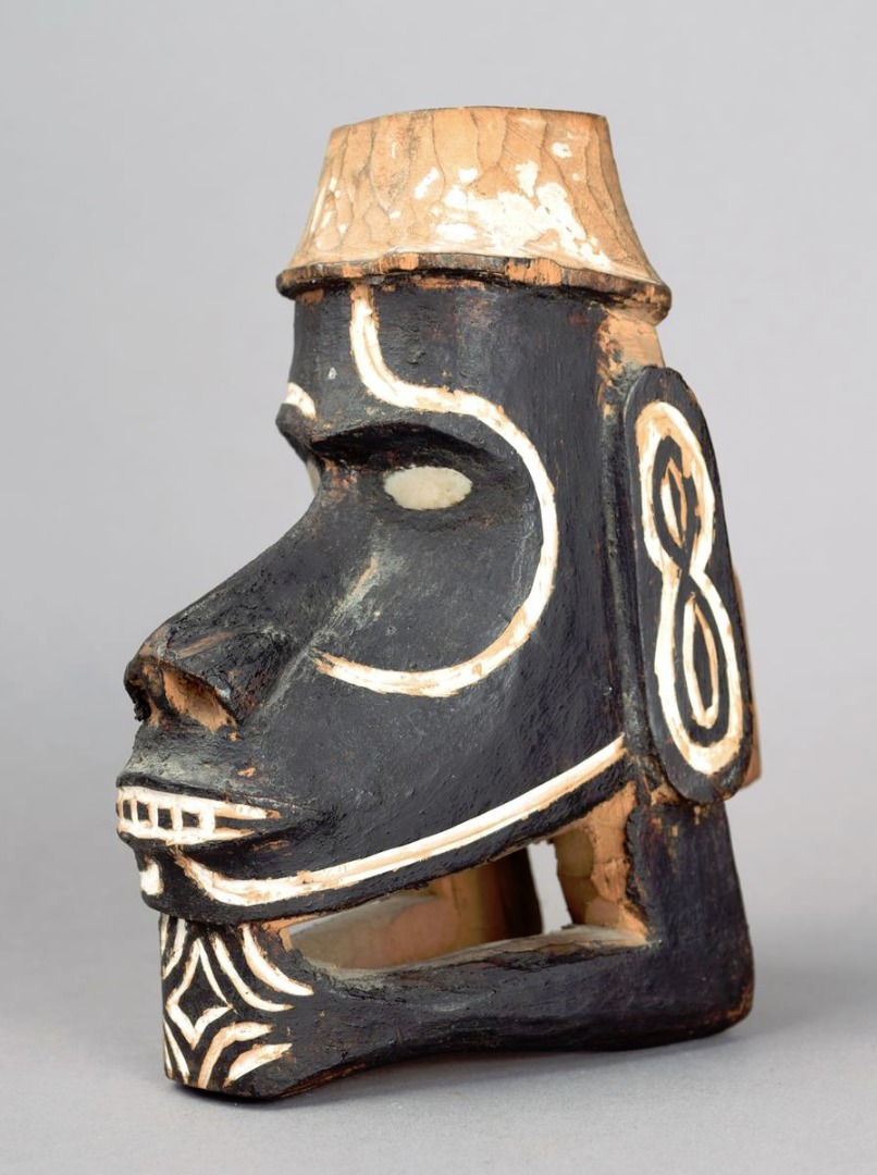 wood, carved a head with hands under the chin, with shell eyes, black and lime staining,