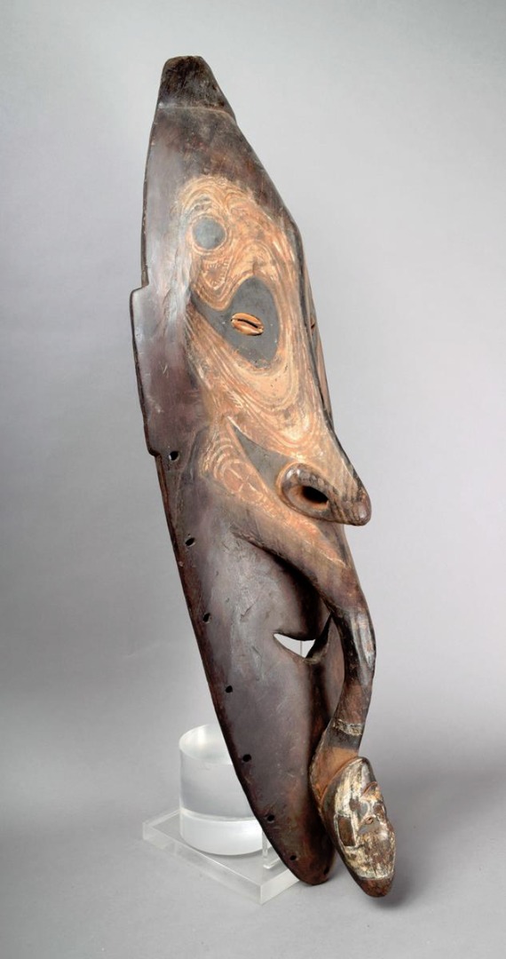 wood, with inset cowrie shell eyes and with pigment decoration,