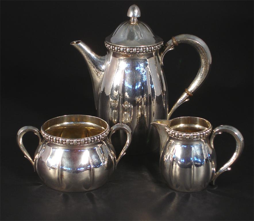 A C J Moinichen, Danish silver three piece coffee set comprising coffee pot with hinged cover, milk jug and sugar basin stamped marks date mark 1920, coffee pot 22.5cm. high