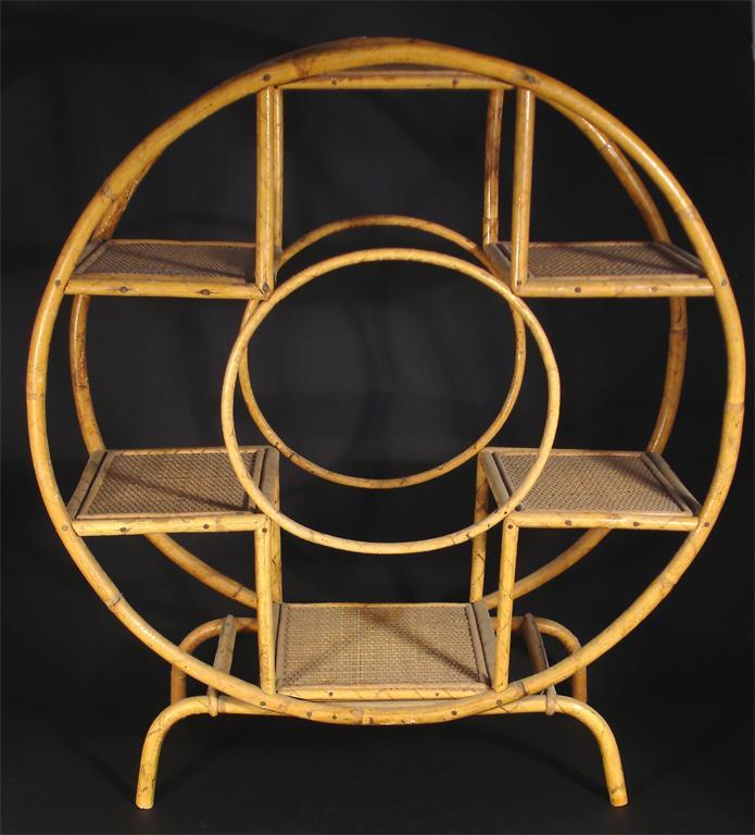 A bamboo and rattan display shelf circular form with six square section shelves 66cm. high