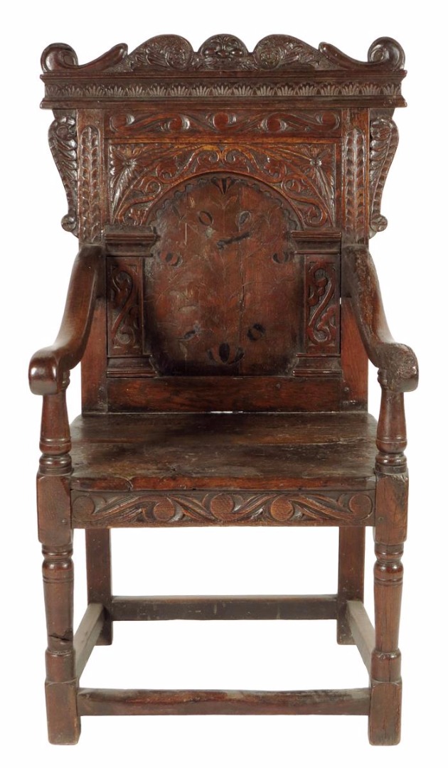 A 17th century and later oak panel back open armchair, the scroll carved toprail centred a male mask above an arched panel back inlaid with bog oak and holly with flowers and a bird, the solid seat on turned front legs and peripheral stretchers.