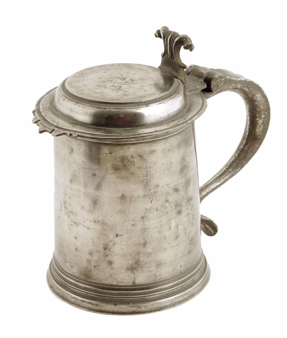 A Charles II pewter tankard, the hinged lid with owner's initials 'W S' over 'C W', with a crenellated lid and a rams horn thumbpiece, with maker's mark to interior 'L S', 18.5cm high.