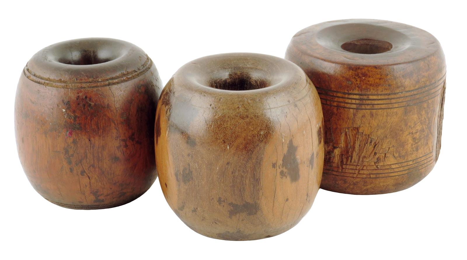 Treen. Three 19th century chogs, hardwood and lignum vitae, 9cm diameter (max). (3)