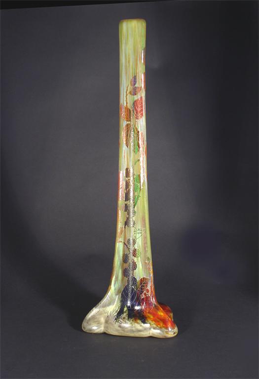 A tall Daum Nancy enamelled cameo glass vase lobed cylindrical neck enamelled in colours with...