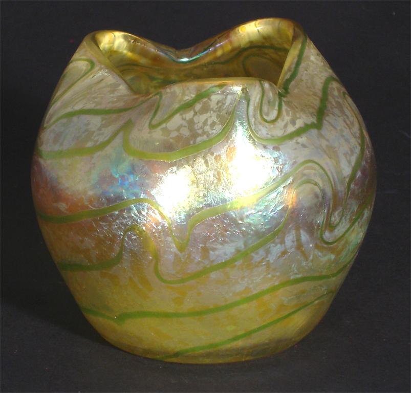 A Loetz glass vase ovoid with pinched trefoil rim, covered in a veined golden iridescence unmarked 11cm. high