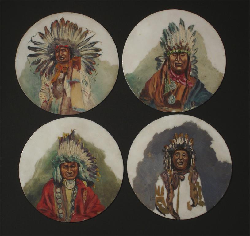 Four painted glass Red Indian portrait roundels indistinctly named unsigned, minor rim nicks 13.5cm. diam.