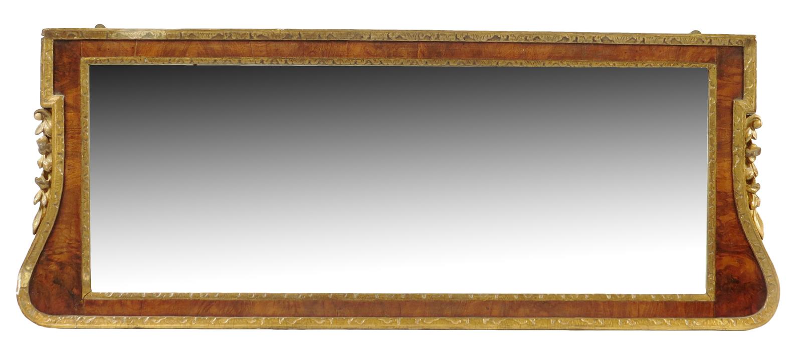 A George II walnut and giltwood overmantel mirror, the later bevelled glass plates within a moulded slip and a conforming outer border with carved flower garlands, 48.5 x 126.1cm.