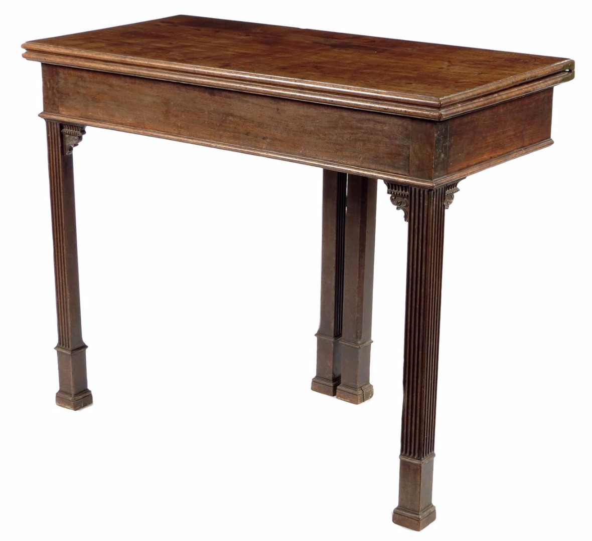 A George III mahogany card table, the fold-over top on unusual gate supports on fluted legs with leaf carved and beaded brackets, 74cm high, 91.5cm wide, 45ccm deep.