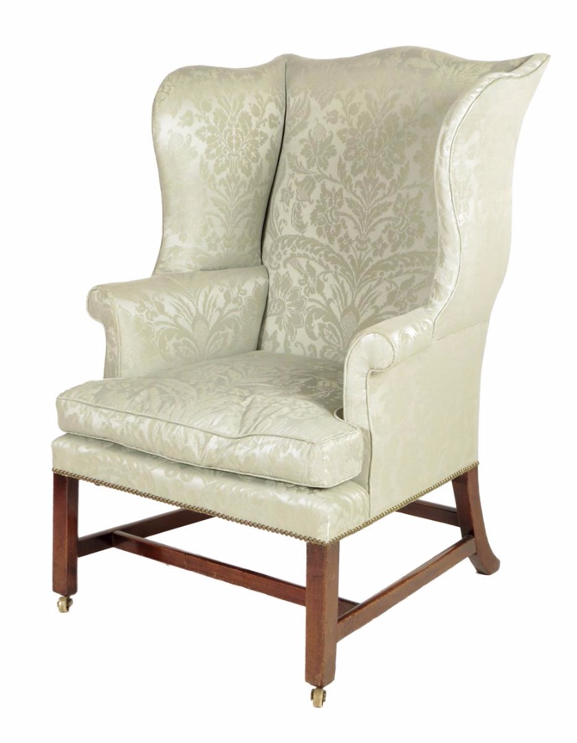 A George III wing armchair, upholstered with later damask fabric on chamfered mahogany legs united by an 'H' stretcher, the front legs on brass castors.