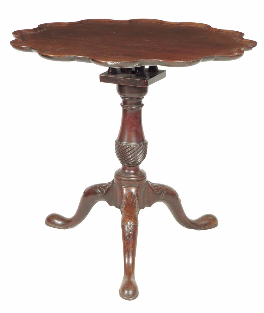 An early George III mahogany tripod table, the circular tilt-top with a piecrust edge, revolving on a birdcage on a turned and spiral ribbed stem and shell capped cabriole legs, 71.4cm high, 76cm wide.