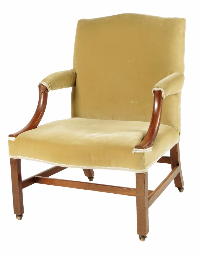 A George III mahogany 'Gainsborough' armchair, the serpentine padded back above downswept arms and chamfered front legs united by an 'H' stretcher on roller castors.