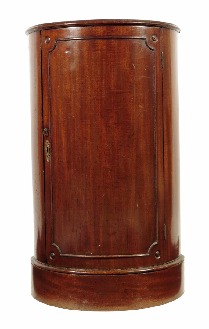 A George III mahogany corner pedestal cupboard, the hinged door with outline mouldings and turned rondels, revealing two shelves, 83cm high, 48.5cm wide, 47cm deep.