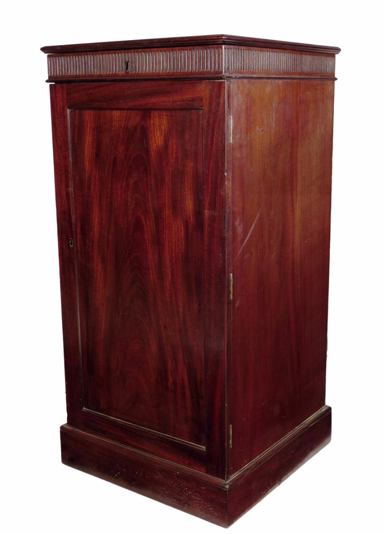 A George III mahogany pedestal cupboard, the hinged top revealing a vacant interior above a fluted frieze and a panelled door enclosing three adjustable shelves, 120cm high, 59cm wide, 58.5cm deep.