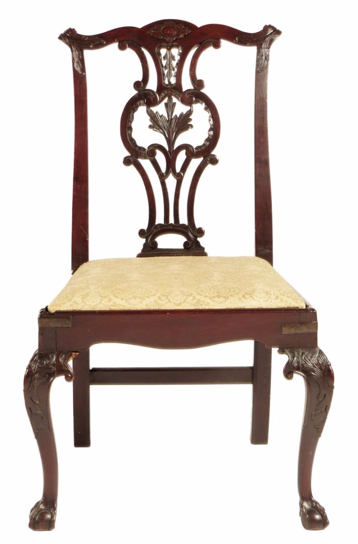 A George III mahogany side chair, the serpentine top rail with leaf carved scroll ears above a pierced and leaf carved splat, with scrolls and rocaille above a drop-in seat on carved cabriole legs and claw and ball front feet.