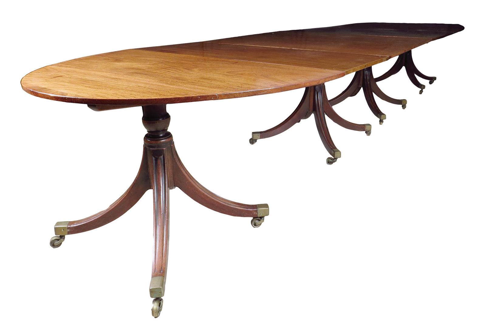 A George III and later mahogany four pillar dining table, with a pair of 'D' ends and a pair of central sections with two additional leaves on turned gun barrel stems with moulded splay legs terminating in brass caps and castors, 72cm high, 121cm wide, 448cm long (extended).