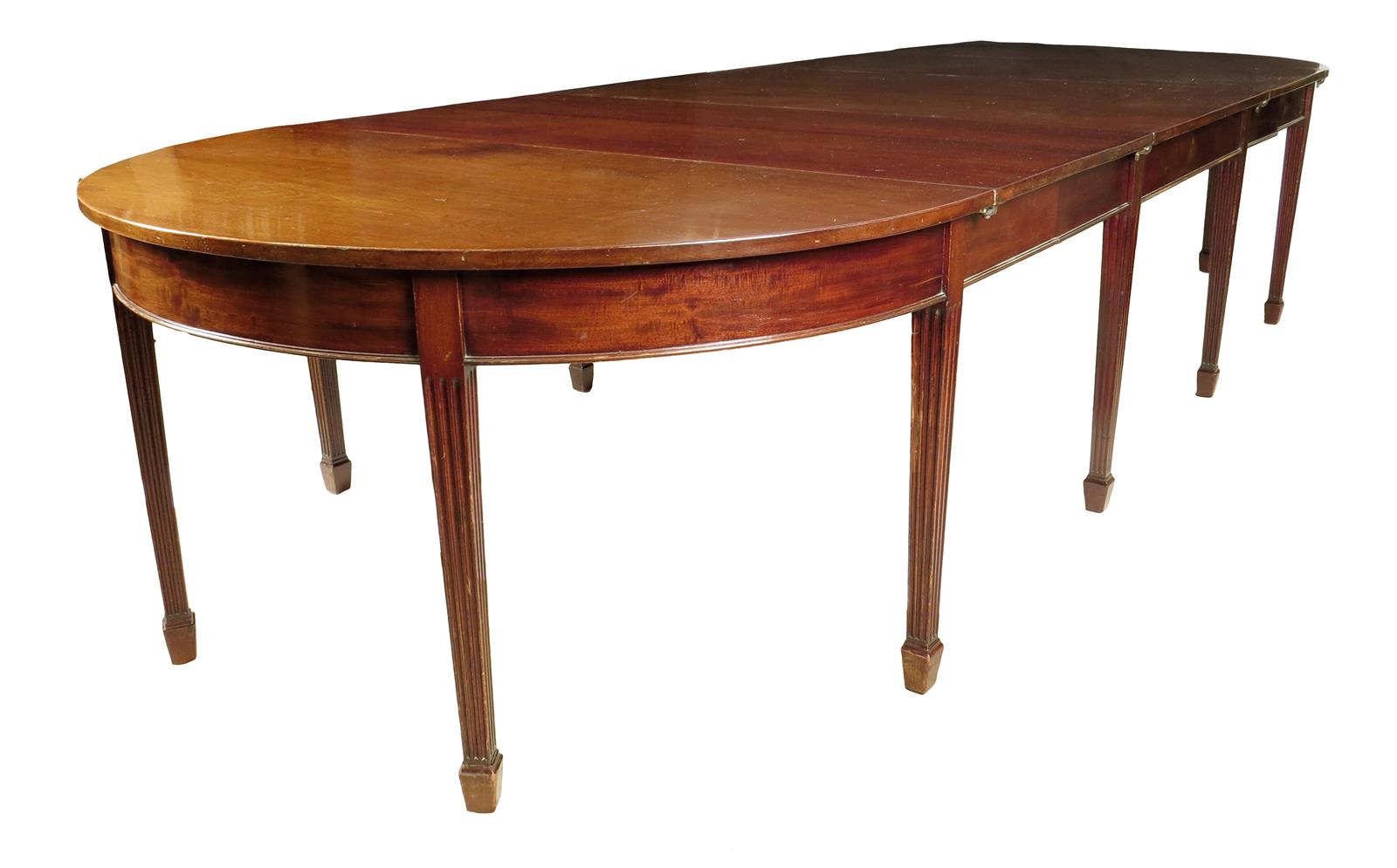 A George III and later mahogany dining table, comprising: a pair of 'D' ends and a central section with two additional leaves on fluted tapering legs and spade feet, 71.5cm high, 137.5cm wide, 360cm long (extended).